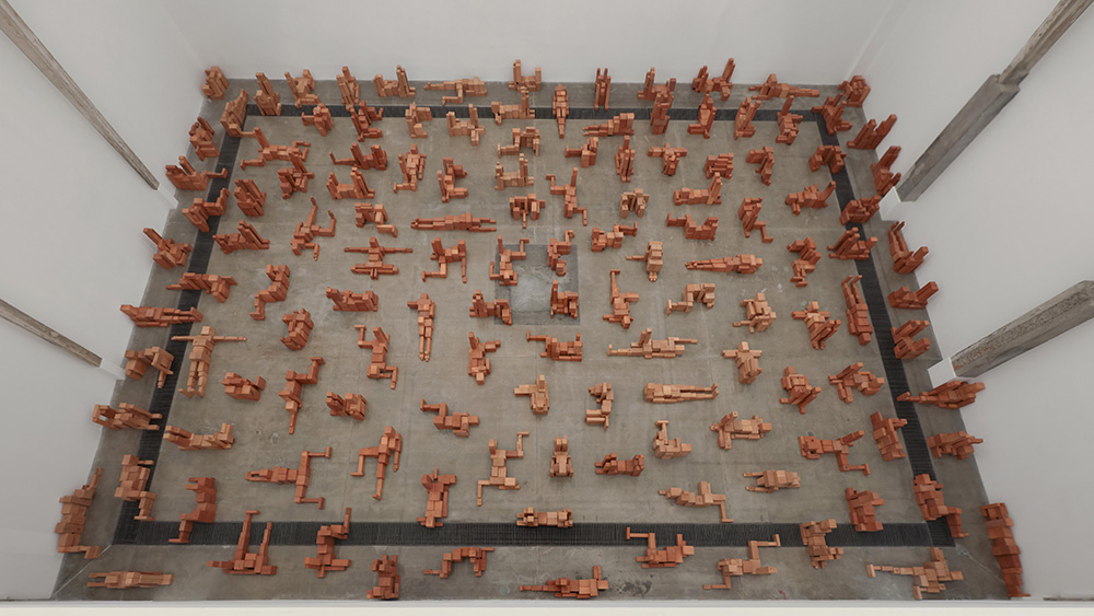 “栖息之所”展览现场,常青画廊,北京,中国2024-25。《栖所 II》Resting Place II,2024,赤陶,132个形象,尺寸可变。摄影:Huang Shaoli.