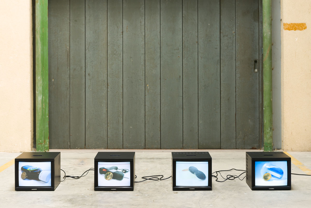 《岛屿》2006-2009,视频装置 - 4个视频(《2元!2元!》/《1镑!1镑!》/《1欧元!1欧元!》/《1美元!1美元!》)
