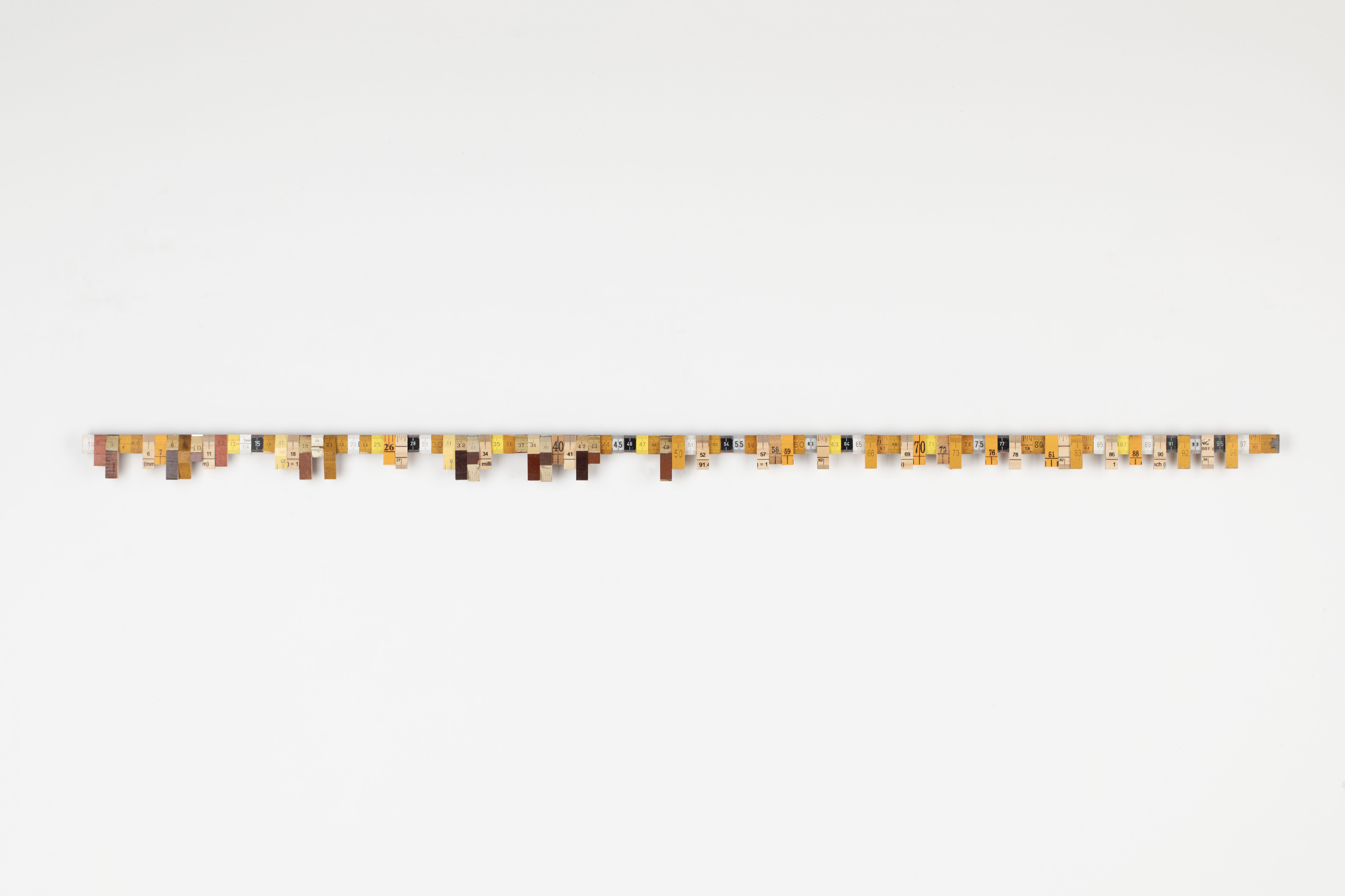 《得寸进尺11》Meter XI,2024,100把旧尺子拼接(木材、钢),4.5×100×2厘米,©️艺术家工作室