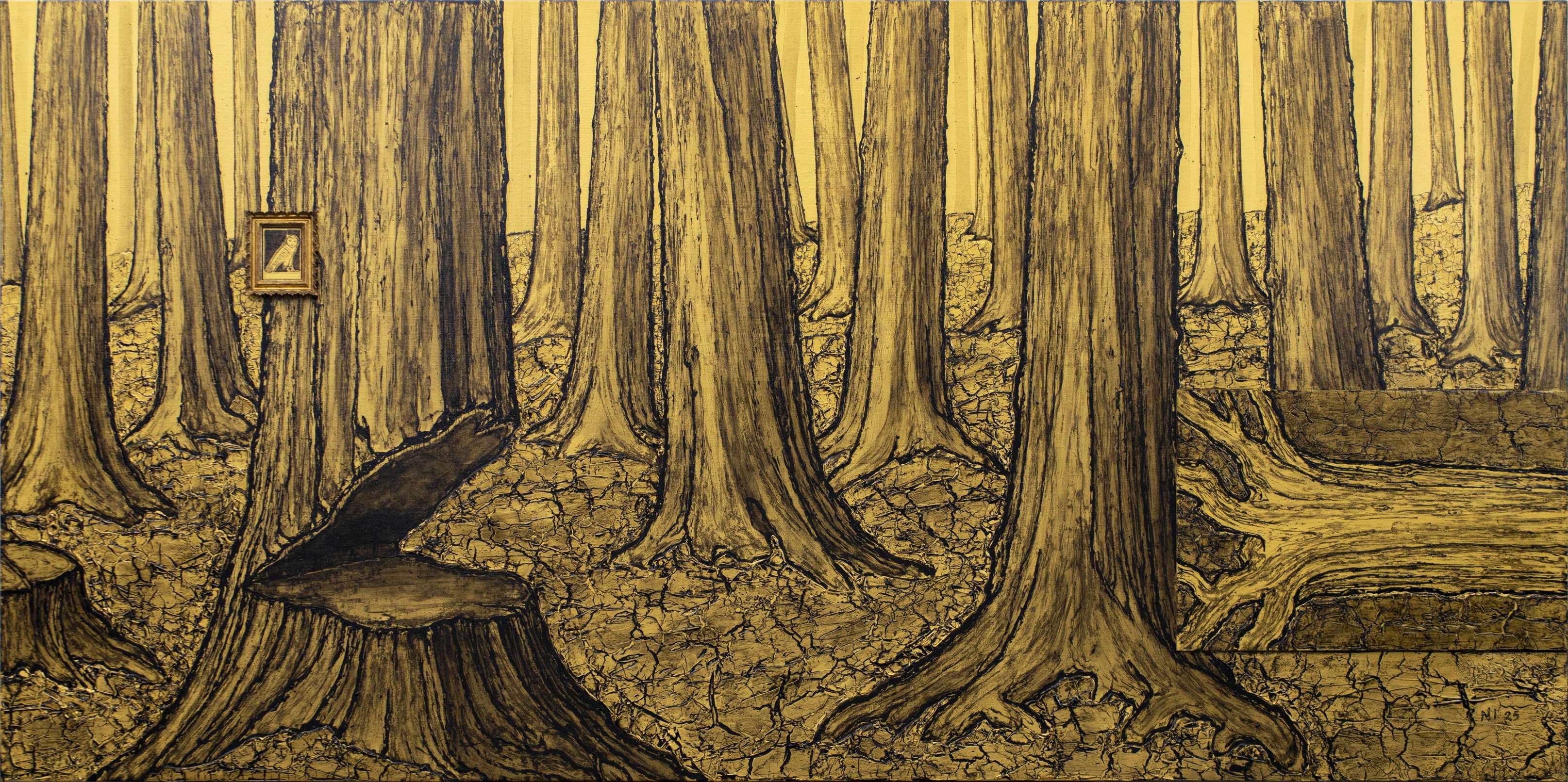 《林中画会5》(局部)The Painting Exhibition in the Woods V,2025,布面综合材料,120×720厘米(三联),©️艺术家工作室