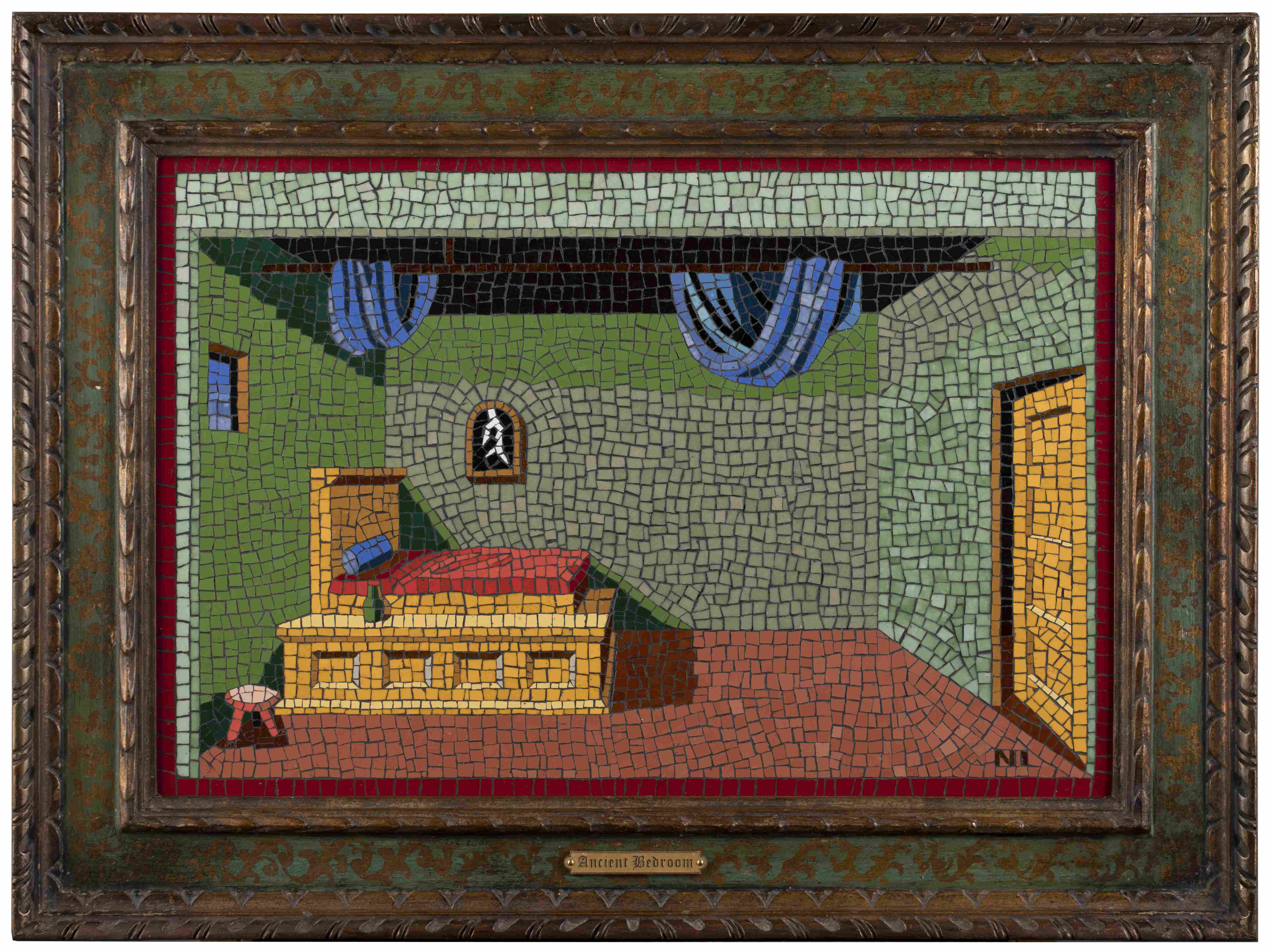 《古代卧室15》Ancient Bedroom XV,2025-2026,亚克力板上陶瓷马赛克及古董画框,39×52.5厘米,©️艺术家工作室