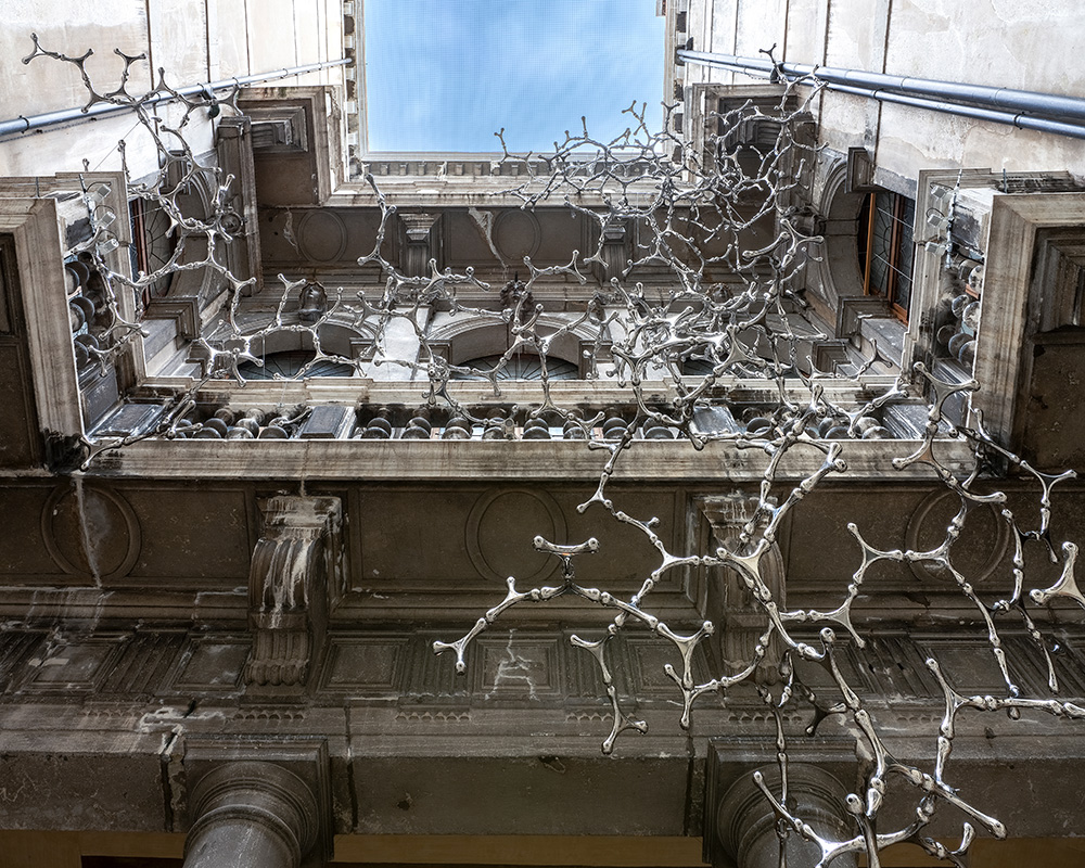 《水骨(随机合唱交响曲)》WATERBONES (Stochastic Choral Sinphony),2018,不锈钢元素,特定场地尺寸。罗马瑞吉酒店,2018。摄影:Ela Bialkowska,OKNO Studio