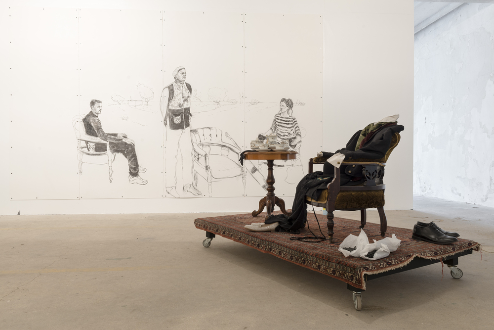 《太空奇遇》Space Oddity,2013,18小时表演装置。元素包括:圆形古董桌、古董扶手椅、古董茶具、服装(外套、衬衫、马甲、连衣裙、袜子、2双鞋、手套、首饰)、绘画。摄影:Oak Taylor-Smith