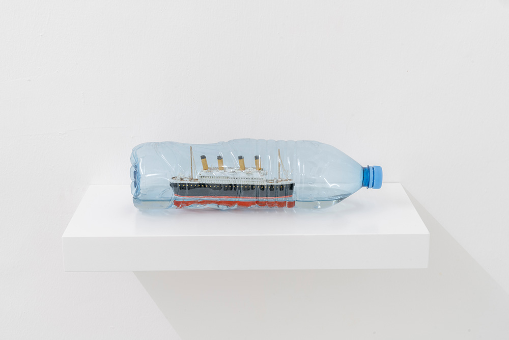 《漂流瓶(泰坦尼克)》2020 年,塑料、木材、纸张、树脂、颜料,9.5 × 35 × 9.5 厘米。摄影:Ela Bialkowska,OKNO Studio。