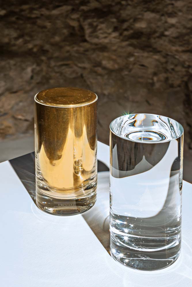 《水金属》Aquaurum,2014-2015,2个玻璃杯、钛、水、黄金。摄影:Ela Bialkowska