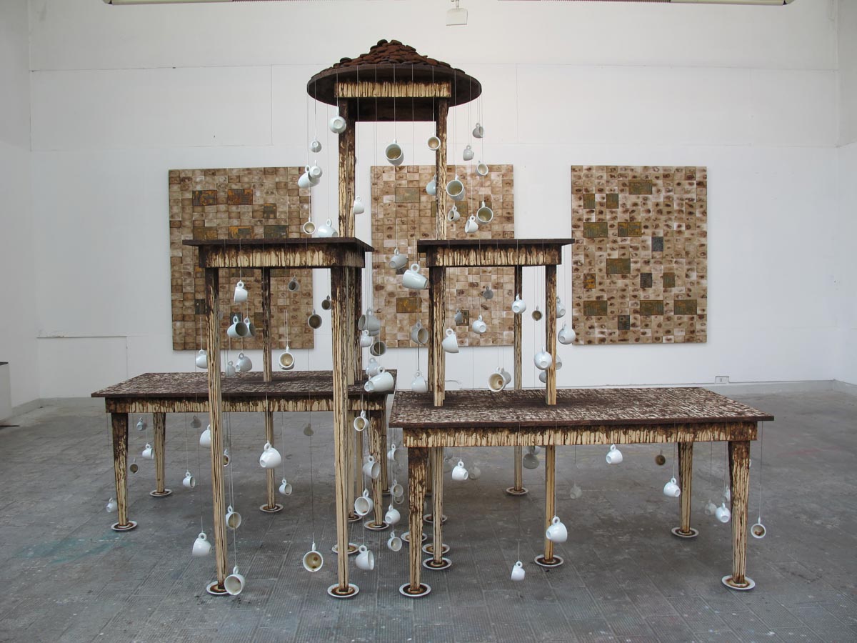 《异乡咖啡馆》2012年,桌子、杯子、咖啡,280 x 190 x 350 厘米
