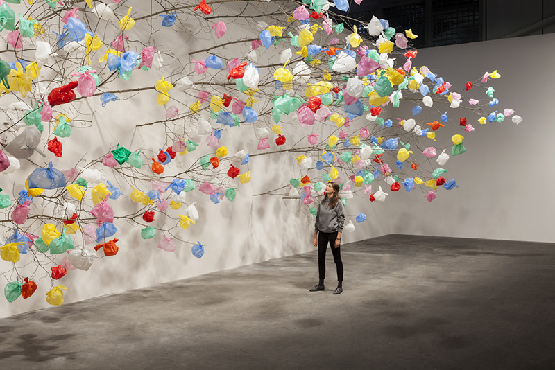 帕斯卡尔·马尔蒂那·塔尤《塑料树》,Plastic Tree,2014/2015,树枝、塑料袋,可变尺寸,巴塞尔艺术展「意象无限」展区,2015,© ADAGP, Paris。摄影:Andrea Rossetti