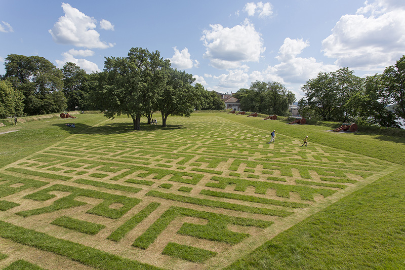 莫塔兹·纳塞尔《迷宫(人民想要推翻政权)》,The Maze (The People Want the Fall of the Regime),2012,草地库法体书法现场特别项目,挪威奥斯陆阿克斯胡斯城堡(2012年6月28日-8月26日),63 × 36 m,摄影:Leif Gabrielsen